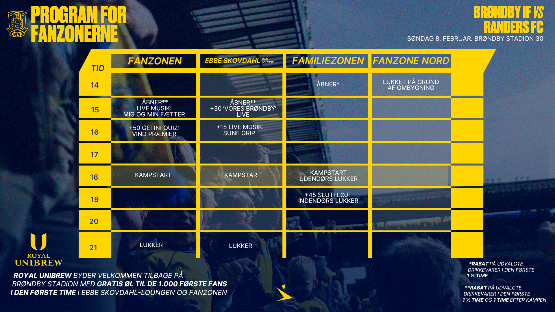 Forårspremieren markerer ikke kun gensynet med Superliga-bolden, når Brøndby IF tager imod Randers FC — det er også dagen, hvor Royal og Faxe Kondi vender tilbage på Brøndby Stadion. Det fejrer vi sammen med fansene: De første tusinde gæster i Fanzonen og Ebbe Skovdahl Fan Lounge bliver nemlig budt velkommen med kolde drikkevarer den første time og ægte kampdagsstemning fra første minut.